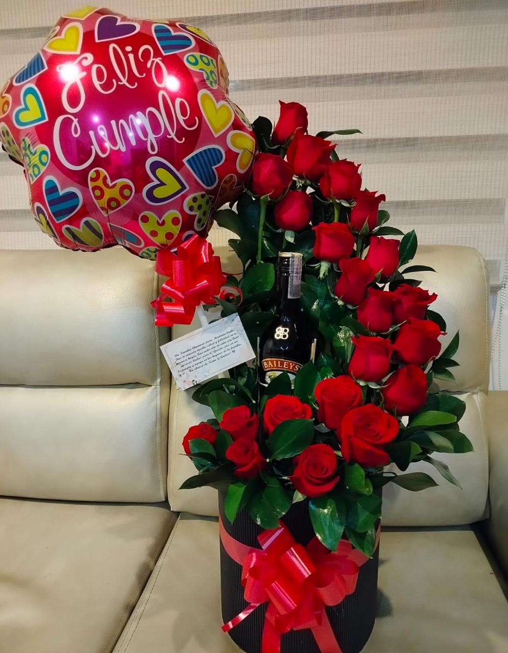 Arreglo de rosas con media botella de baileys y globo metalizado