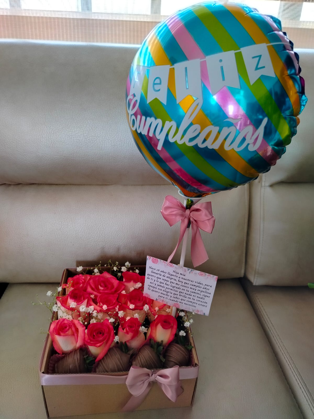 Sé el primero en valorar “Caja por 12 rosas, 8 fresas achocolatadas y globo grande metalizado”