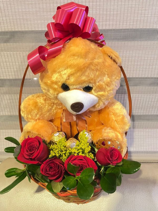 Canasta de oso con ferrero y 4 rosas