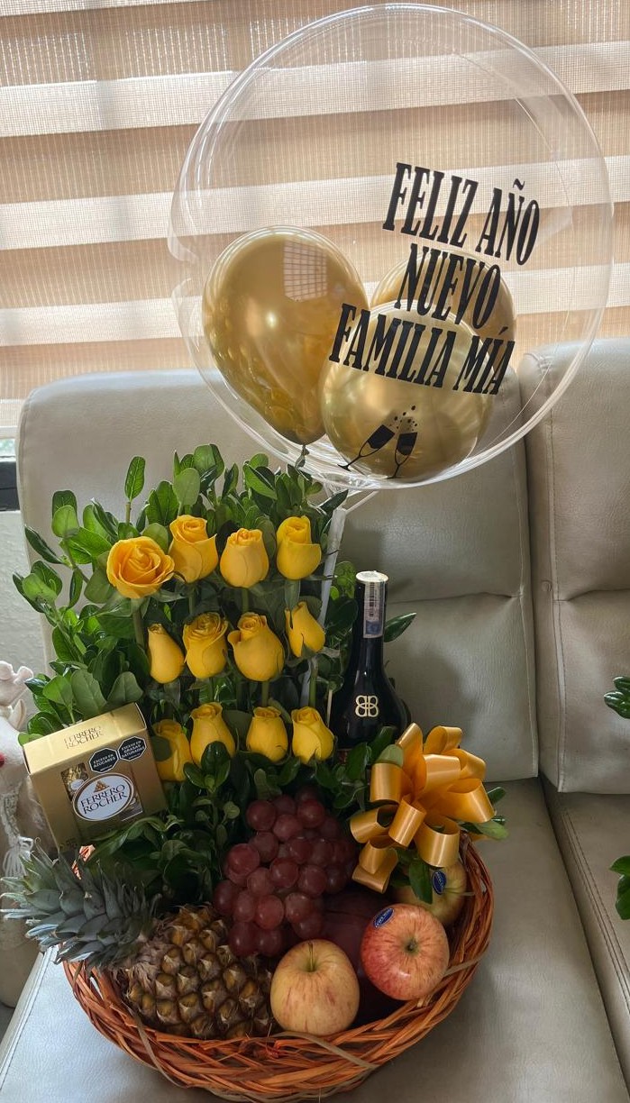 Canasta frutal, con ferrero por 4 unidades, media botella de baileys y globo burbuja personalizado